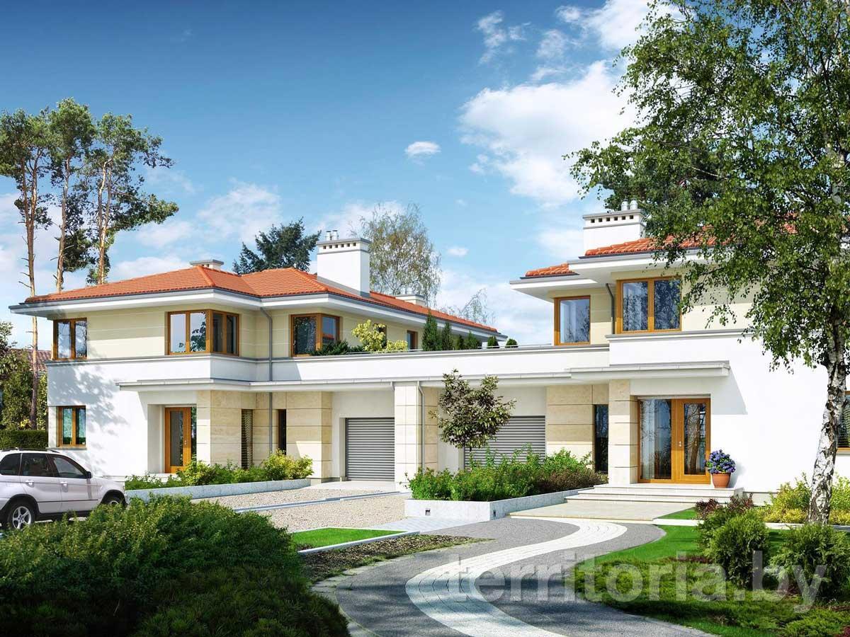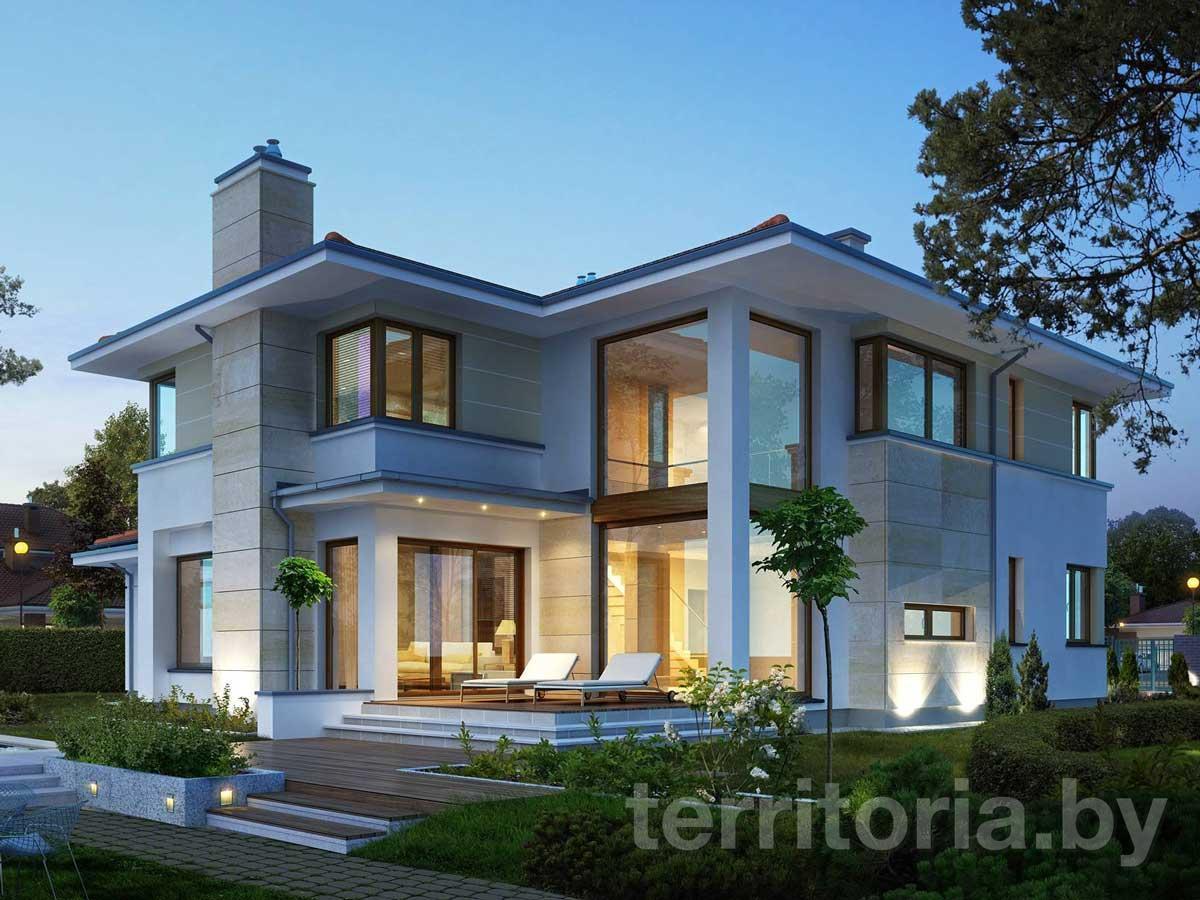 Отличительными особенностями этого дома являются второй свет и эксплуатируемая терраса над гаражом.В отделке используется штукатурка и плиты из натурального камня — вентилируемый фасад.