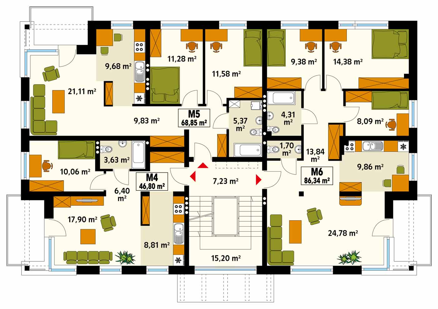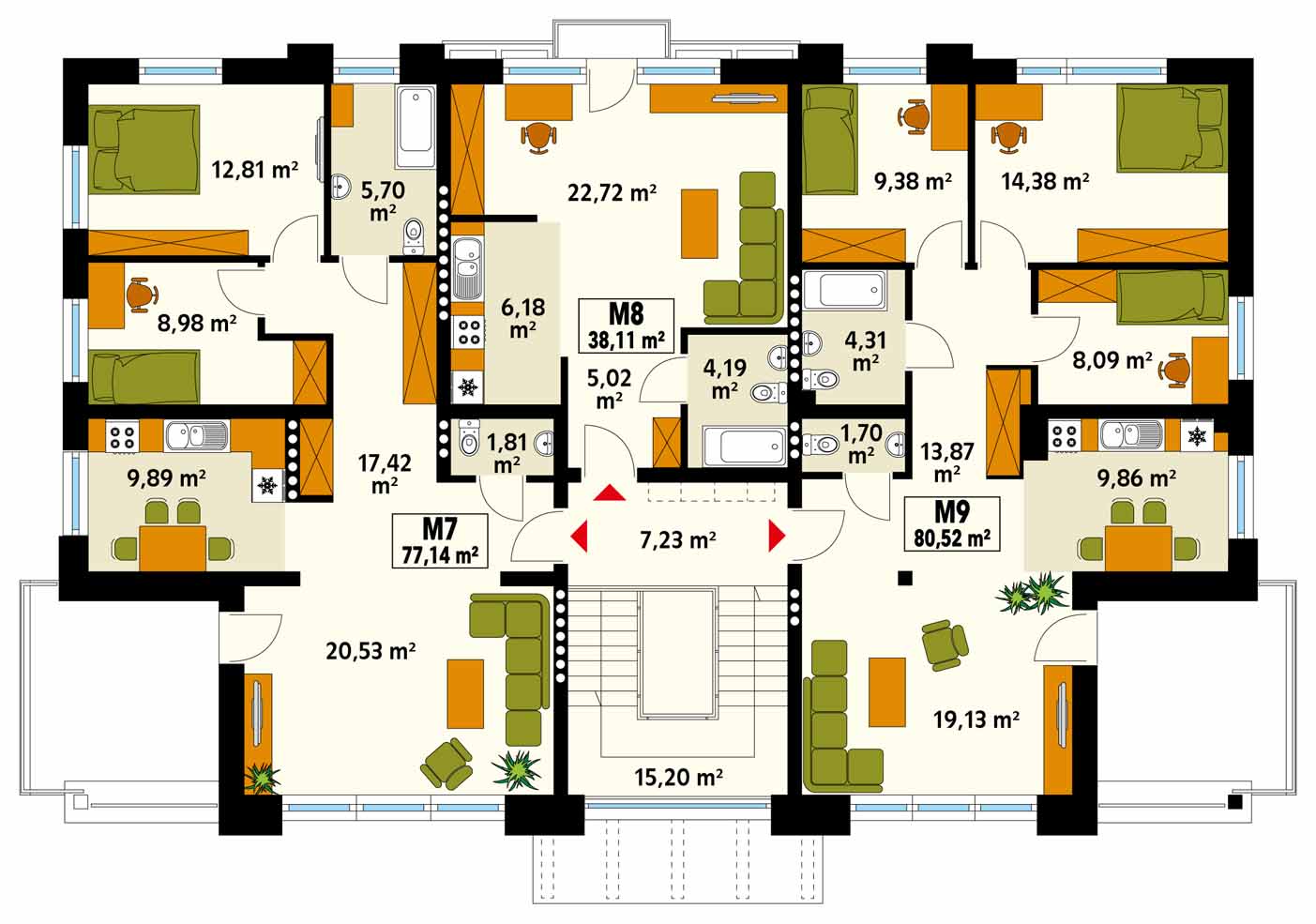 На каждом этаже находится по 3 квартиры. Это одна, двух, и трехкомнатные квартиры с разными вариантами планировки. Кухня, как правило, совмещена с гостиной. Во всех квартирах есть небольшой балкон.
